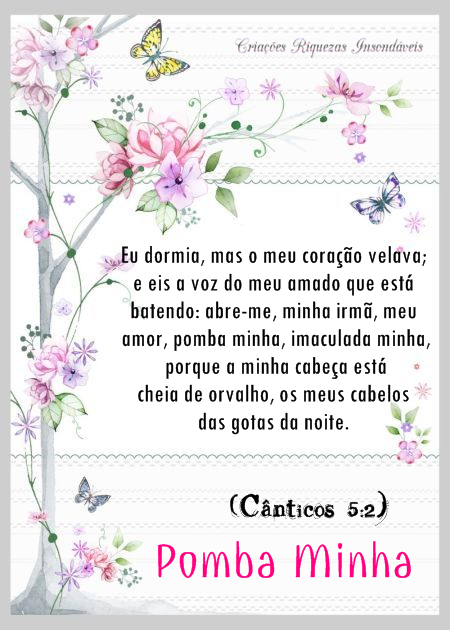 que, no livro de Cântico dos Cânticos, a amada é chamada de "pomba minha" (5:2)? Uma vez que a amada simboliza a nós, cristãos, que características há numa pomba para sermos comparados a ela? A primeira refere-se a seu olhar (1: 15). Os olhos da pomba são meigos e mansos, não se percebe neles violência ou ira. Seu olhar é singelo, por isso vê apenas uma coisa de cada vez, fitando seus olhos somente no objetivo a ser alcançado, não se distraindo com as coisas à sua volta. A segunda é o seu senso de direção. Ela sabe exatamente onde ir e como voltar. A terceira, sua condição- de pureza, por possuir uma dieta saudável e adequada, alimentando-se de sementes de vida. E a quarta, sua fidelidade, pois, ao perder seu companheiro, jamais irá em busca de outro.